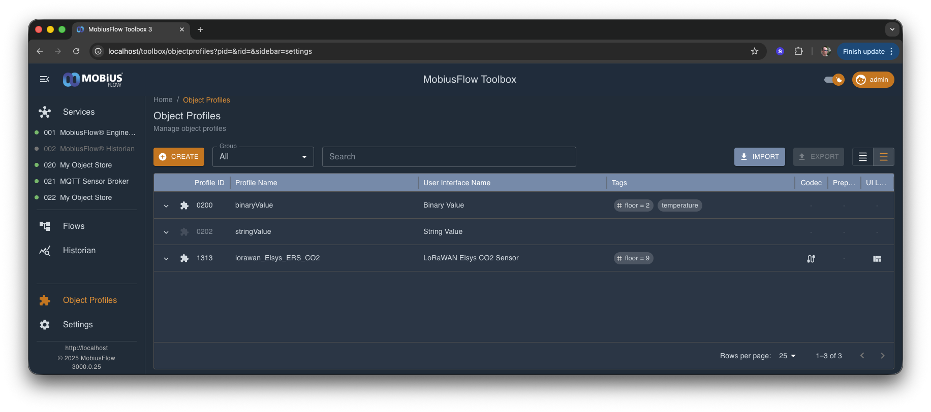 The object profiles table shows a list of all of the profiles that exist on this instance of MobiusFlow. Any profiles that have not been used to create objects, and therefore can be deleted are shown with a greyed out PID and icon.