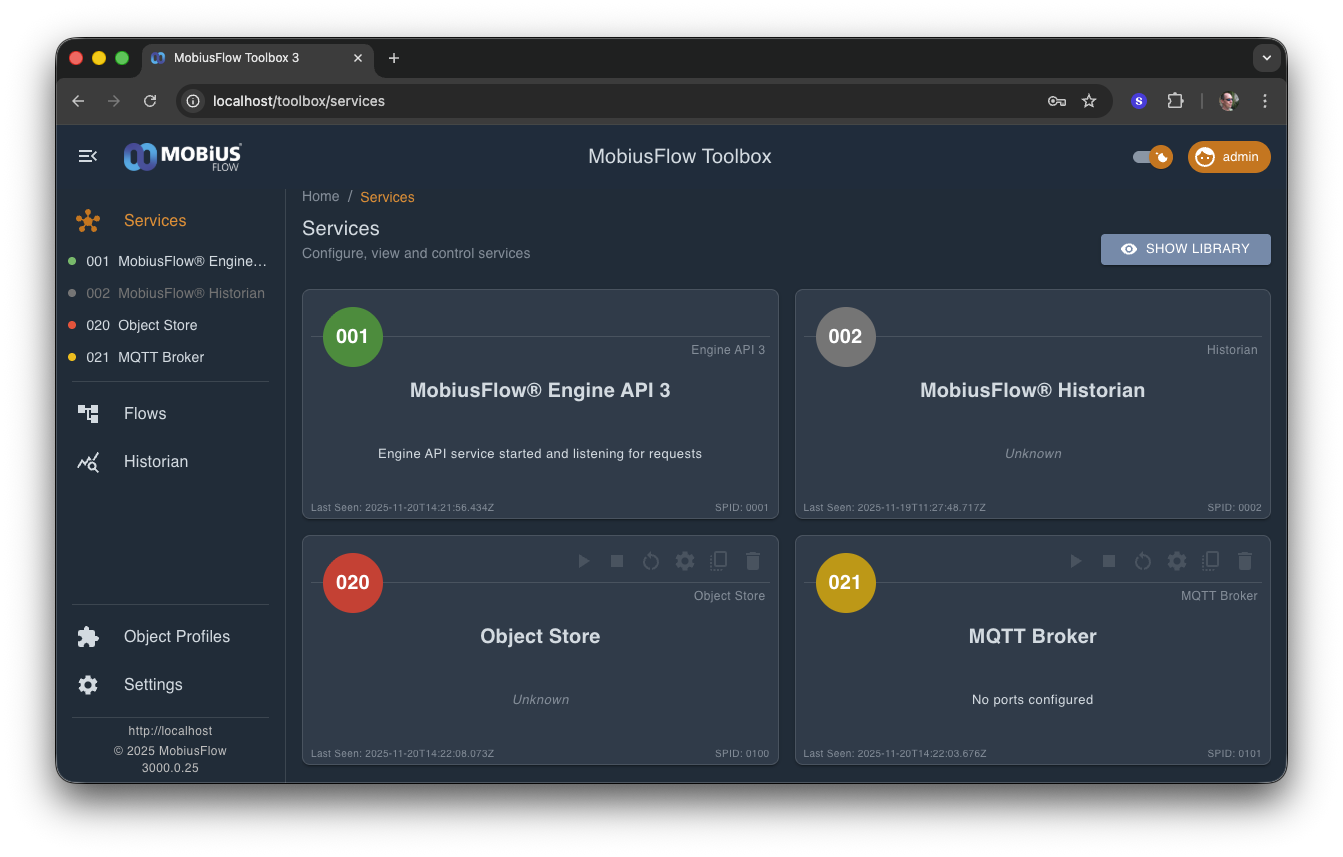 MobiusFlow Services are the starting point for any configuration. They are typically device drivers for a specific protocol or provide protocol interfaces such as an MQTT broker.
