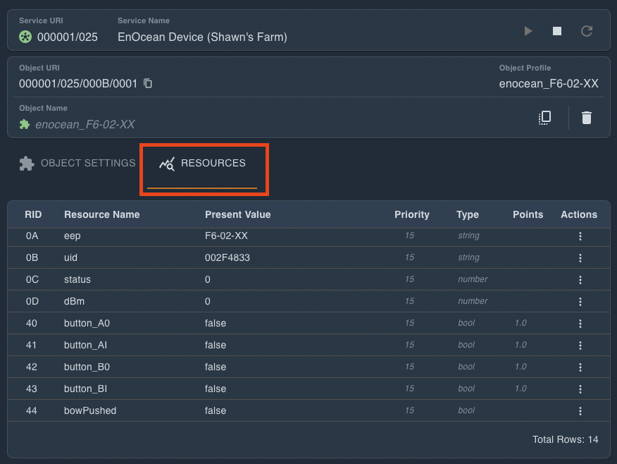 Once the object is live, any decoded data from the corresponding EnOcean device can viewed by navigating to that objects resources: