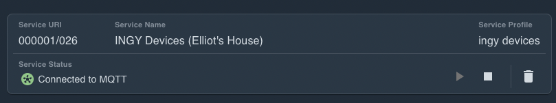 The INGY service will attempt to connect via MQTT to the INGY gateway when the service is started. As such, to test the connection, start the service and observe the service status: