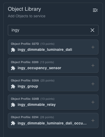 Searching *ingy* in the objects library will display the list of options of MobiusFlow objects that can represent the real-world INGY devices.