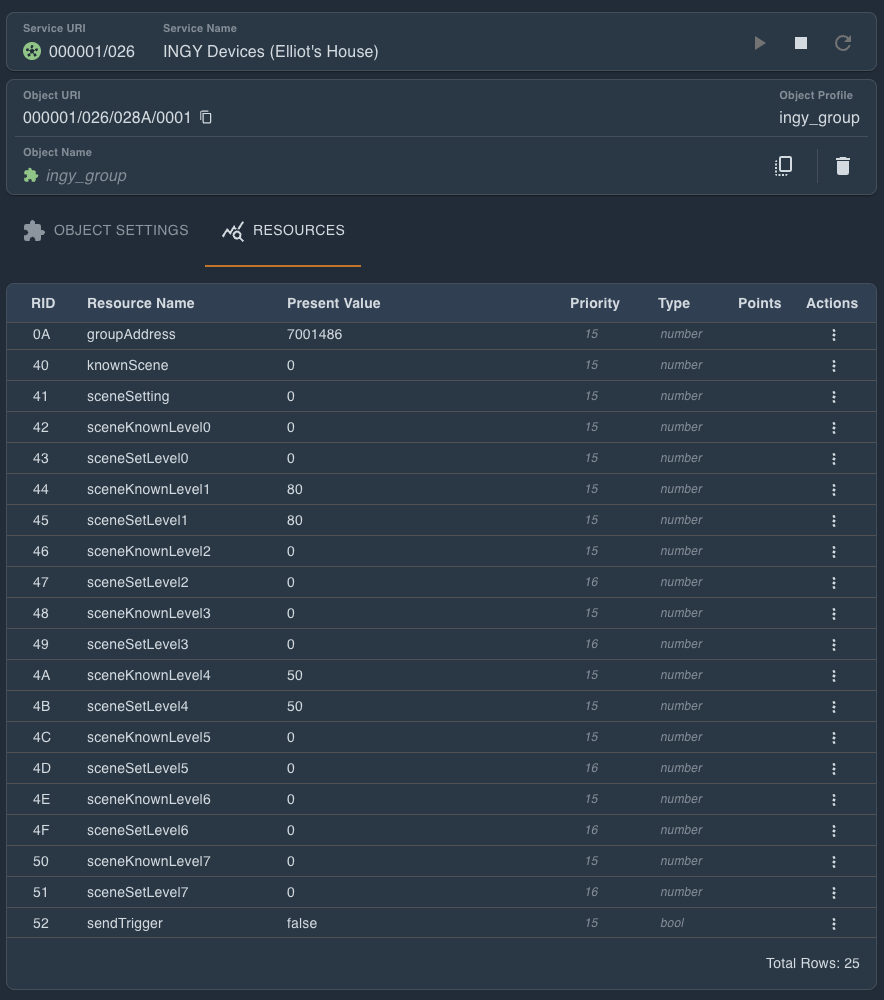 Each lighting group supports 8 different scenes (numbered 0 - 7). These may have been previously set up using the INGY app. MobiusFlow will automatically query the level set point of each scene and will display this in the corresponding *knownLevel* resource. MobiusFlow can also be used to change each scene's level set point (0 - 100) by setting that scene's corresponding setLevel resource. The resource will indicate the message is being sent. To resend the message, simply set the resource again.